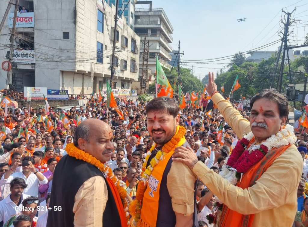 रायपुर। भारतीय जनता पार्टी रायपुर जिले के सभी सातों प्रत्याशियों ने एक साथ रैली की शक्ल में कलेक्ट्रेट परिसर पहुंचकर नामांकन दाखिल किया।रायपुर दक्षिण विधानसभा से बृजमोहन अग्रवाल, पश्चिम से राजेश मूणत, उत्तर से पुरंदर मिश्रा, ग्रामीण से मोतीलाल साहू , अभनपुर से इंद्रकुमार साहू, आरंग से गुरु खुशवंत साहेब और धरसीवां से भाजपा ने छत्तीसगढ़ी सिने स्टार अनुज शर्मा को अपना प्रत्याशी बनाया है। भाजपा के सभी प्रत्याशी आज दोपहर रैली की शक्ल में अपने अपने विधानसभा से भाजपा कार्यालय एकात्म परिसर पहुंचे। जहां सभी 7 प्रत्याशी एक साथ रथ में सवार होकर रायपुर लोकसभा सांसद सुनील सोनी, जिला भाजपा अध्यक्ष जयंती पटेल, भाजपा के कई वरिष्ठ कार्यकर्ताओं सहित रैली की शक्ल में नामांकन दाखिल करने रवाना हुए। प्रत्याशियों के रथ के आगे बाजे गाजे , ढोल , नगाड़ा , बग्गियां और विशेष आकर्षण में विशालकाय पुतले साथ चल रहे थे। भाजपा कार्यालय से लेकर कलेक्ट्रेट परिसर तक जनता का हुजूम साथ चल रहा था। पूरी सड़क समर्थकों से खचाखच भरी हुई थी। सभी ने हाथों में भाजपा के झंडे पकड़ रखे थे। भाजपा समर्थक लगातार भाजपा जिंदाबाद , जीतेगा भई जीतेगा कमल का फूल जीतेगा और अऊ नई सहिबो बदल के रहिबो जैसे नारे लगा रहे थे। भाजपा कार्यालय से कलेक्ट्रेट परिसर तक पूरा रास्ता भाजपामय हो गया था।
