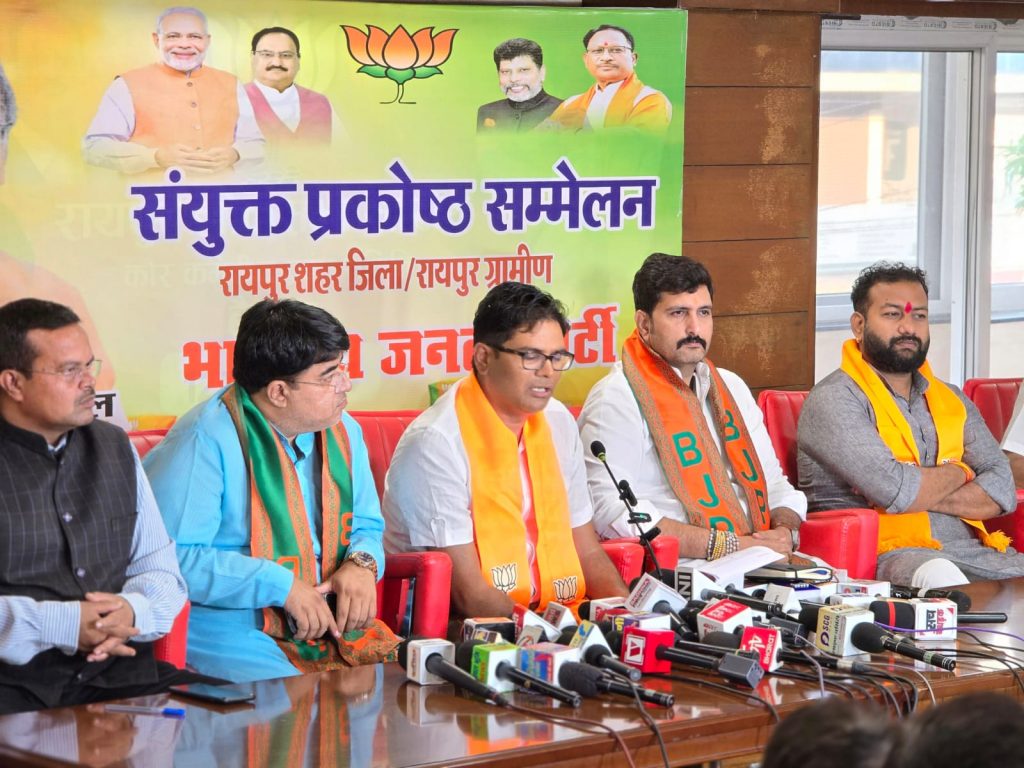 इस दौरान पत्रकार वार्ता में प्रदेश महामंत्री जगदीश रामू रोहरा, प्रदेश मीडिया प्रभारी अमित चिमनानी, सह प्रभारी अनुराग अग्रवाल, प्रदेश प्रवक्ता नलिनीश ठोकने, अमित साहू, मुकेश शर्मा भी मौजूद थे।