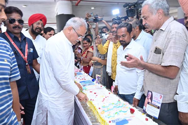 रायपुर। मुख्यमंत्री भूपेश बघेल ने अपने जन्मदिन के अवसर पर मल्टीलेवल पार्किंग में डेढ़ सौ फीट की लंबाई वाला केक काटा। मुख्यमंत्री के जन्मदिन पर यह स्पेशल केक बोंजेलो द्वारा तैयार किया गया है। डेढ़ सौ फीट की लंबाई वाले इस केक का कुल वजन 430 किलोग्राम है। बेकिंग और आइसिंग डिवीजऩ के 65 लोगों की टीम ने 24 घंटे की मेहनत से इसे तैयार किया है। पूरे केक में छत्तीसगढ़ सरकार की प्रमुख फ्लैगशिप योजनाएं एवं मुख्यमंत्री श्री भूपेश बघेल की तस्वीरों की मिनी स्टैंडी लगाई गई है।