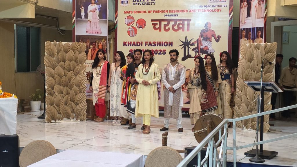 गांधी जयंती के उपलक्ष्य में MATS स्कूल ऑफ फैशन डिजाइनिंग एंड टेक्नोलॉजी, रायपुर द्वारा 7 अक्टूबर 2025 को भव्य खादी फैशन शो “चरखा” का आयोजन किया गया। इस कार्यक्रम का उद्देश्य भारतीय वस्त्र विरासत को सम्मान देना और युवा डिजाइनरों में स्वदेशी कपड़ों के प्रति रुचि जागृत करना था।