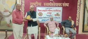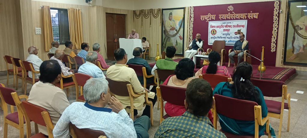 मुख्य अतिथि प्रान्त संघचालक प्रोफे. टोपलाल वर्मा ने प्रान्त की बहुल बायोडाइवर्सिटी का पूर्ण उपयोग करते हुए आयुर्वेद को जन जन तक पहुंचाने की ज़रूरत बताई ! पूर्व सांसद डॉ. जांगड़े ने अपनी आयर्वेद यात्रा के अनुभव बताए ! ” भारतीय स्वास्थ्य दिवस : धन्वन्तरि जयंती ” पर ” स्वास्थ्य संरक्षण ज्ञान यज्ञ ” के रजत जयंती वर्ष में ” स्वास्थ्य जागरण सप्ताह ” का आयोजन किया गया ! आयुर्वेद की बढ़ती हुई रूचि के चलते परिषद अध्यक्ष डॉ. मनोहर लहेजा ने एक सिटी आयुर्वेद चिकित्सालय एवं स्वास्थ्य शिक्षण केन्द्र की आवश्यकता बताई, इस हेतु पार्षद स्वप्निल मिश्रा ने सहयोग देने का आश्वासन दिया !