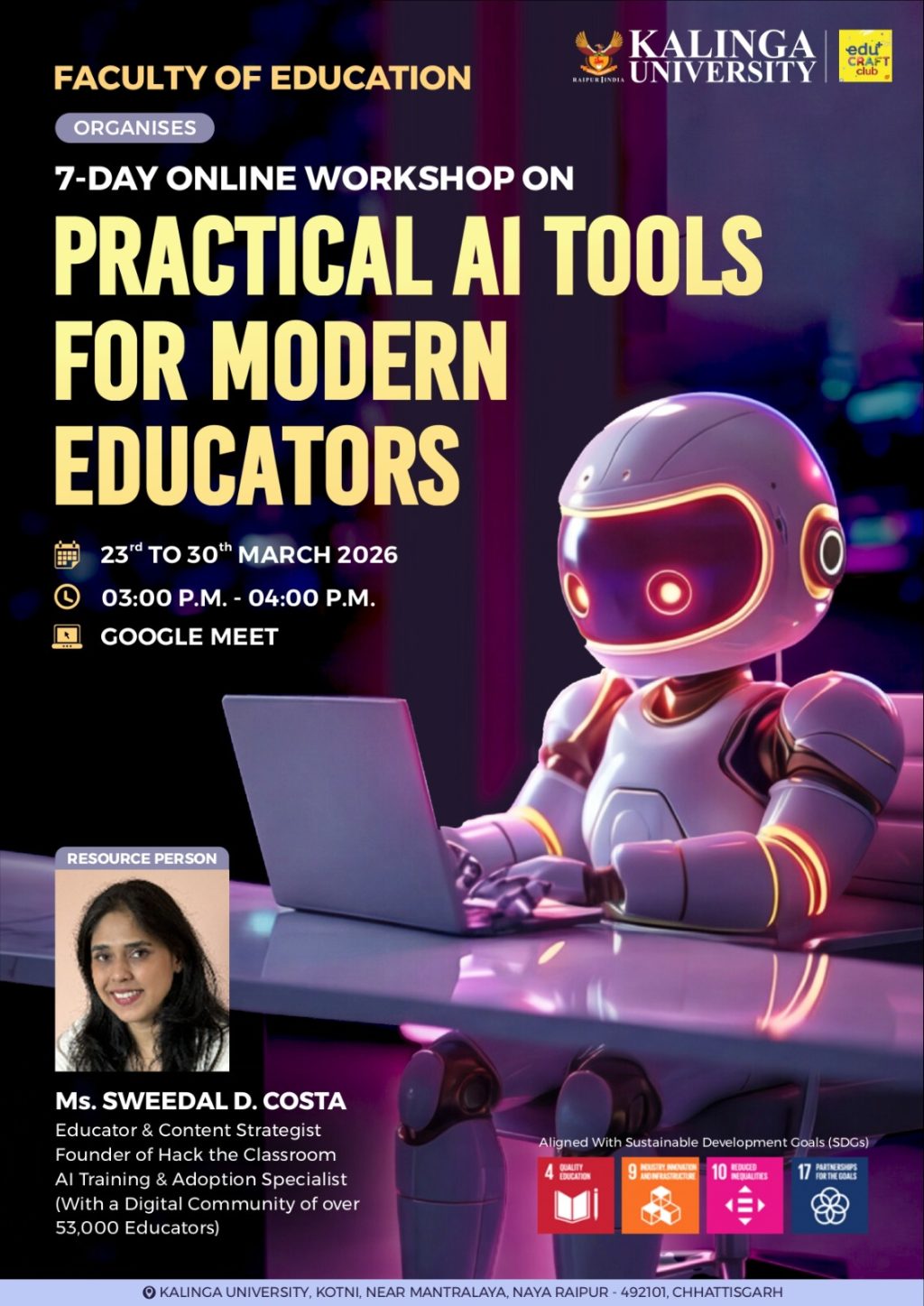 कलिंगा विश्वविद्यालय के शिक्षा संकाय द्वारा 23 से 30 मार्च, 2026 तक “आधुनिक शिक्षकों के लिए व्यावहारिक एआई उपकरण” पर आयोजित सात दिवसीय कार्यशाला का सफलतापूर्वक समापन हुआ 。 इस कार्यशाला में कुल 135 पंजीकरण प्राप्त हुए, जिसमें शिक्षकों, शोधकर्ताओं और छात्रों ने उत्साहपूर्वक भाग लिया 。