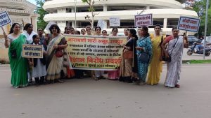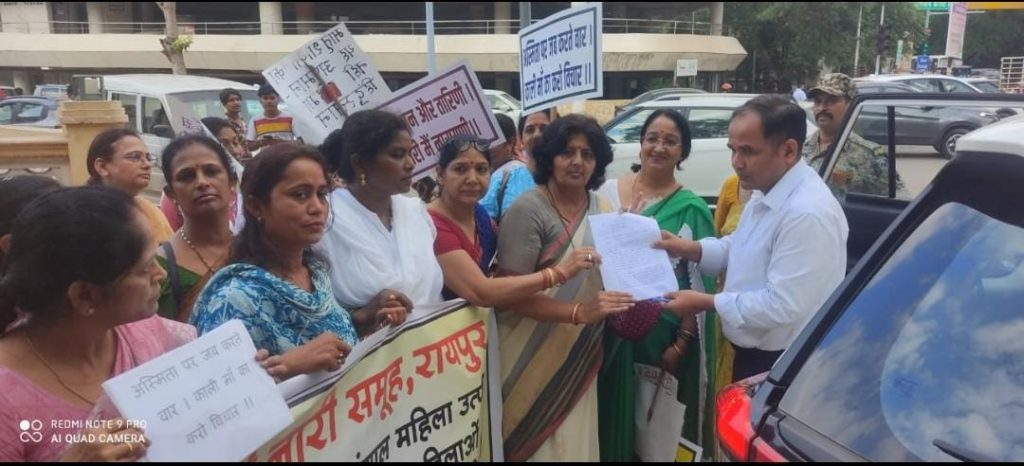 रायपुर । नारायणी नारी समूह के नेतृत्व में आज महिलाओं के विविध समूह ने शाम 04:30 बजे पश्चिम बंगाल के उत्तर दिनाज़पुर (चोपरा) में युगल के साथ बर्बरतापूर्ण घटना से अत्यंत व्यथित होकर तथा महिलाओं के साथ हो रहे अनुचित एवं असभ्य व्यवहार के विरोध में रायपुर की बहनों के द्वारा गृह मंत्री, भारत सरकार के नाम ज्ञापन रायपुर कलेक्टर डॉक्टर गौरव सिंह को ज्ञापन सौंपा। विशेष बात यह रही कि रायपुर कलेक्टर डॉक्टर गौरव सिंह स्वयं उस स्थान पर पहुंचे जहां नारायणी नारी समूह की बहनें अपना विरोध प्रदर्शित कर रहीं थी।