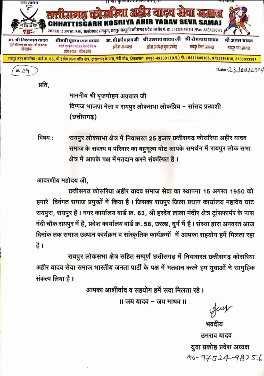 जारी विज्ञप्ति में उमराव यादव ने कहा कि विगत 30 वर्षों से बृजमोहन अग्रवाल जी का साथ और सहयोग हमारे यादव समाज को निरंतर मिल रहा है। हमारी हर छोटी बड़ी तकलीफों में हम उनके पास जाते हैं और वह एक पारिवारिक सदस्य की तरह यादव समाज कि लोगों का साथ देते हैं।